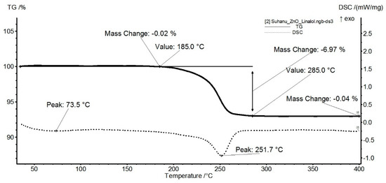 The thermal analysis for the ZnO@LiN sample (Figure 5) indicates the presence of a single mass loss process. The sample is stable up to 185 °C, with negligible mass loss (0.02%). This indicates that during the loading process, the previous solvent traces were removed. The mass loss of 6.97% is recorded between 185 and 285 °C. The process is accompanied by an endothermic effect, with the minimum at 251.7 °C. The linalool molecules loaded on the surface of ZnO NPs are eliminated in this step (linalool b.p. = 199 °C). By comparing the mass loss values for this interval for both samples (simple ZnO and linalool loaded ZnO), we estimate that the linalool quantity loaded on ZnO is ~0.78%.