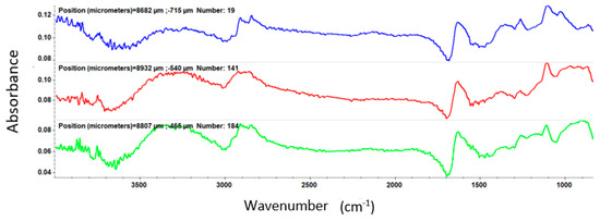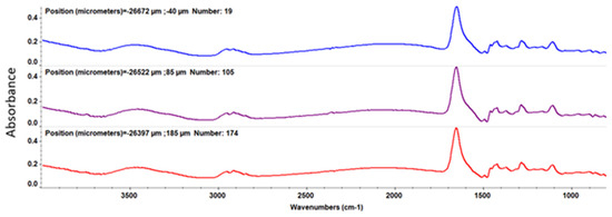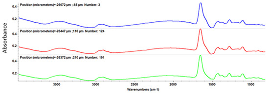To confirm the preservation of the structural integrity of the deposited coatings of bare and surface-modified ZnO NPs after laser processing at various fluences, we used the infrared microscopy (IRM) technique. IR maps acquisition was performed with a Nicolet iN10 MX FT-IR Microscope equipped with a liquid nitrogen-cooled mercury cadmium telluride (MCT) detector. The spectral collection was obtained operating in reflection mode in the wavenumber range from 4000 to 600 cm−1 with a spectral resolution of 4 cm−1. The collected spectra (32 scans per spectrum) were overlapped, and absorbance maps were created based on the second derivative of the spectral data using Ominc Picta Version 8.0 (Thermo Fischer Scientific Company, Waltham, MA, USA) software.