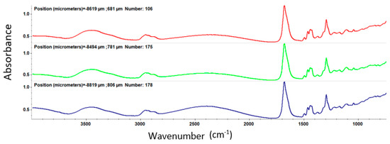 At a laser fluence of 200 mJ/cm2 (Figure 7), the intensity of absorption bands is low due to the reduced amount of sample deposited on the substrate, while, at a laser fluence of 300 mJ/cm2 (Figure 8), clear peaks are registered.