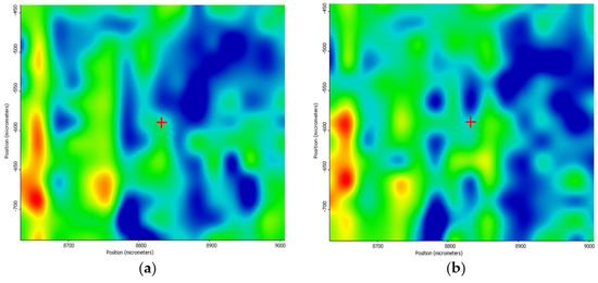 In the case of the coatings prepared at 200 mJ/cm2 laser fluence, an improvement concerning the deposition on the silicon substrate can be observed (Figure 11). Although warmer colors are noticed, they are not uniformly distributed on the substrate, revealing that the transferred material is focused on small areas on the substrate surface.