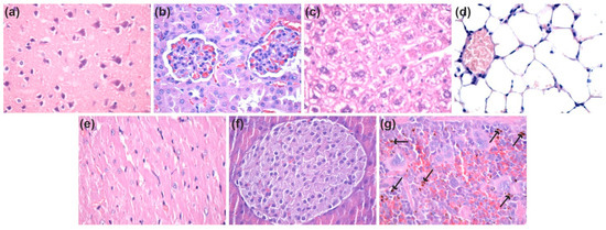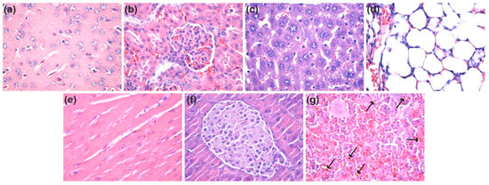 Micrographs of cross-sections through the mice internal organs treated with ZnO NPs after seven days (HE staining, ×400): (a) Brain; (b) Kidney; (c) Liver; (d) Lung; (e) Myocardium; (f) Pancreas; (g) Spleen (see arrows for ZnO@LiN NPs). HE: Hematoxylin–Eosin. (×100).