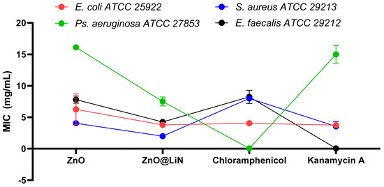 In order to quantify the antimicrobial effect of the prepared nanoparticles, a minimum inhibitory concentration (MIC) assay was performed. The antibacterial efficiency of ZnO@LiN NPs was compared with that of bare ZnO NPs and broad-spectrum antimicrobial agents (i.e., chloramphenicol and kanamycin A, utilized as recommended by CLSI 2019) [48] commonly used in the treatment of severe infections. (Figure 17). The obtained results demonstrate the strongest antimicrobial activity for ZnO@LiN NPs against all tested pathogens. These NPs are observed to be especially efficient against S. aureus strain, its MIC value being much lower than the values obtained for chloramphenicol and kanamycin A. Nonetheless, its antimicrobial behavior against P. aeruginosa is significantly stronger than that of kanamycin A.