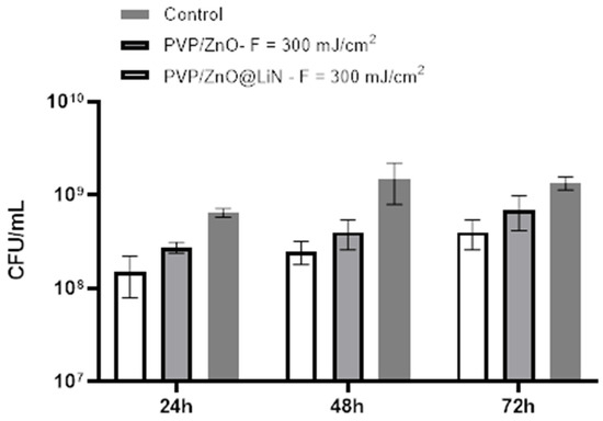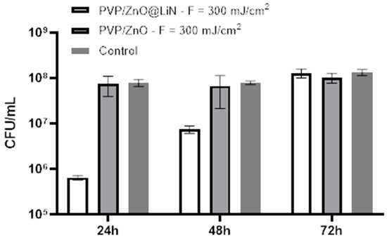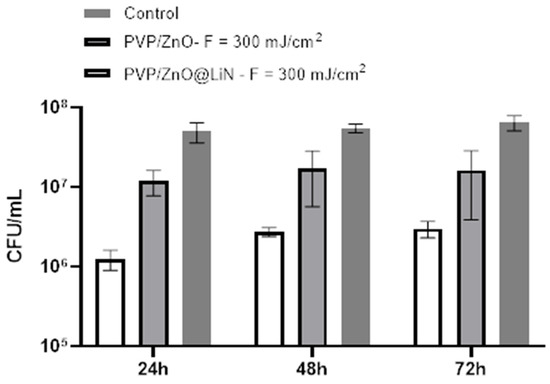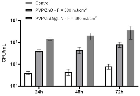 In what concerns the effect of PVP/ZnO@LiN against S. aureus, similar anti-adherent properties are observed throughout the entire incubation period (Figure 20). Moreover, although the mature biofilm is more resistant to antimicrobial agents, the CFU/mL values associated with functionalized substrates remain constant at the different tested points in time, suggesting the constant antimicrobial efficiency of the obtained nanostructured coatings for at least three days.