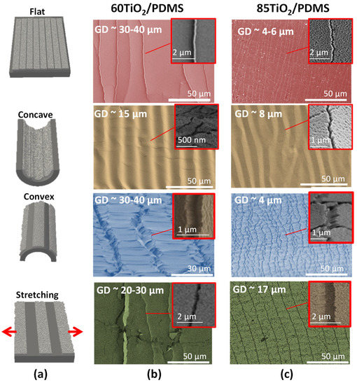 SEM analysis of the surface state of TiO2/PDMS samples subjected to different deformations after a first activation event by bending or stretching. (a) Schematic representation of the different configurations used to take the FESEM images; (b,c) FESEM micrographs of 60°-TiO2/PDMS (middle) and 85°-TiO2/PDMS surfaces (right). From top to bottom: (i) surface images of activated samples in a flat configuration after a first activation by bending; (ii,iii) concave and convex configurations during activation by bending and (iv) stretched samples in a flat configuration. The insets show magnified views of the groove regions. GD: average groove distance, as measured in the images.