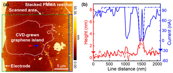 Because CVD-grown graphene flakes were covered with a thin polymer layer during the wet transfer process, polymer residues on top of graphene could not be avoided even after removing the polymer with acetone [34]. Because the residual polymer layer might hinder the observation of the intrinsic electrical conductivity of graphene, it was removed through physical sweeping with an AFM tip in a contact-mode scan [35,36]. After scanning, the polymer residue on graphene was removed and stacked on the right side of the scanned area, as shown in Figure 3a. Due to the removal of the rough polymer residue, the root-mean-square (RMS) roughness decreased from 1.45 nm to 1.07 nm, which was in good agreement with a previous study [35]. Therefore, the local current increased after the removal of the polymer residue (Figure 3b). In addition, contact-mode scanning was performed at a slow rate to avoid defect generation. The unchanged D band in the Raman spectra after scanning indicated that the polymer removal process did not affect the quality of graphene (Figure 2b,d).