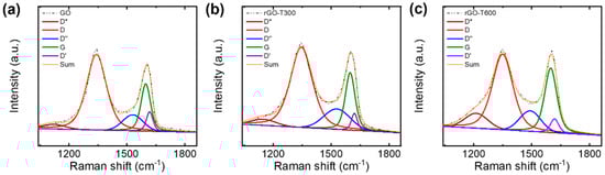 The GO and rGO flakes were characterized using XPS and Raman spectroscopy. The XPS C 1s core-level spectra were deconvoluted with sp2-hybridized carbon (C=C) at 284.5 eV, sp3-hybridized carbon (C-C) at 285.3 eV, C–O at 286.3 eV, C=O at 287.6 eV, and O=C–O at 288.8 eV (Figure 5a–c) [38,39]. In addition, the XPS spectra of rGO flakes included π–π* transitions at 290.7 eV [40,41,42]. Based on the XPS analysis, the GO flakes had a C/O ratio of 1.5, which is similar to that of typical GO [43]. The thermal treatment partially removed oxygen functional groups, thereby increasing the C/O ratio to 4.6 and 5.3 for the rGO flakes annealed at 300 and 600 °C, respectively. The Raman spectra of GO and rGO showed typical D and G bands at ~1350 and ~1580 cm−1, respectively (Figure 5d) [44]. To obtain an accurate estimation of the intensity ratio of the D peak to the G peak, ID/IG, the broad D and G bands were deconvoluted into five components, as shown in Figure 6: G (~1580 cm−1), D (~1350 cm−1), D* (~1150–1200 cm−1), D″ (~1500–1550 cm−1), and D′ (~1620 cm−1) [45,46,47,48]. Three pseudo-Voigt (for D, G, and D’ peaks) and two Gaussian (for D* and D″ peaks) functions were used to fit the Raman spectra in the range of 1000–1800 cm−1 [48]. The analysis of the Raman spectra revealed that ID/IG decreased from 1.56 ± 0.06 for the GO flakes to 1.32 ± 0.07 and 1.08 ± 0.06 for the rGO flakes annealed at 300 and 600 °C, respectively. The change in the characteristics of the Raman spectra indicates the removal of oxygen functional groups [49,50], which is in good agreement with the XPS analysis.