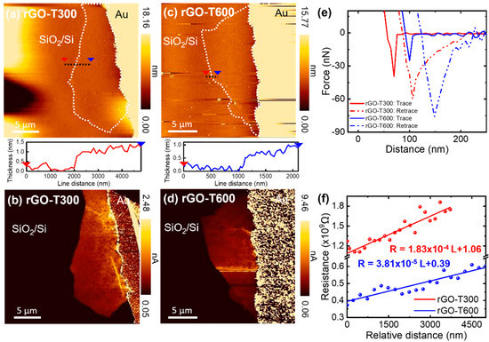 (a,b) AFM images for the (a) topography and (b) current distribution of the rGO flake annealed at 300 °C. (c,d) AFM images for the (c) topography and (d) current distribution of the rGO flake annealed at 600 °C. (e) Force–distance curves. (f) Resistance profiles of the rGO flakes as a function of the distance from the tip to the electrode.