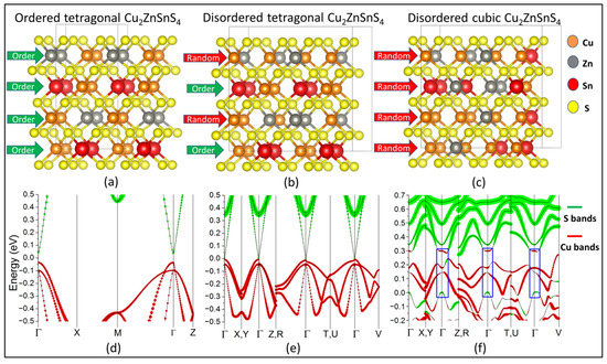 Crystal geometries and orbital-projected bands for the different polymorphs of CZTS: (a) the geometry of ordered tetragonal CZTS; (b) a supercell of disordered tetragonal CZTS; (c) a supercell of disordered cubic CZTS; Orange balls refer to copper ions, red balls refer to tin, gray balls refer to zinc, and yellow balls refer to sulfur; green arrows identify the ordered layers, while red arrows show the layers with cation randomization; (d) the bands for ordered tetragonal CZTS; (e) the bands for disordered tetragonal CZTS; and (f) the bands for cubic CZTS; green circles correspond to the dominant contribution from sulfur-p orbitals, while red circles correspond to the contribution from copper-d orbitals; the blue box highlights the region of band inversion in cubic CZTS.