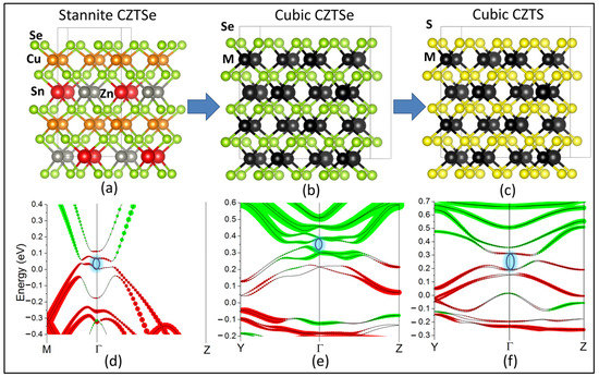 Adiabatic continuity between stannite CZTSe and cubic CZTS: (a) the crystal geometry of stannite CZTSe, (b) the geometry of cubic CZTSe, (c) the geometry of cubic CZTS); orange, red, gray, and yellow circles have the same meaning as in Figure 1, green circles refer to selenium ions, black circles refer to a randomized cation; (d) the bands of stannite CZTSe, (e) the bands of cubic CZTSe, (f) the bands of cubic CZTS; red circles correspond to the dominant contribution from Cu-d orbitals, green circles correspond to the dominant contribution from anion-p orbitals; the black arrow shows the open non-trivial band gap.
