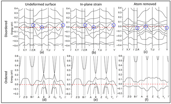 Surface states: (a) the surface band structure of cubic CZTS, (b) the corresponding surface bands under 2% expansive strain in the XY plane, (c) the corresponding surface bands with one sulfur atom removed from the surface; blue circles mark the gapless surface states; (d) the surface band structure of ordered tetragonal CZTS; (e) the corresponding surface bands under 1% expansive strain in the XY-plane, (f) the corresponding surface bands with one sulfur atom removed from the surface.