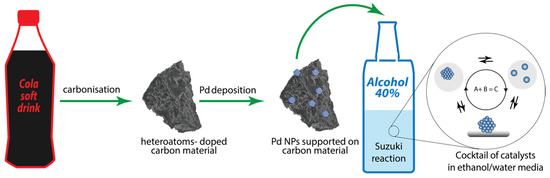 Cola is a soft drink widely available in all countries; it is an inexpensive ready-made solution of organic substances in phosphoric acid. Therefore, the use of cola in laboratory practice as a precursor of carbon materials is economically viable. In this work, we wanted to test whether popular drinks such as cola could be directly used to prepare functional heteroatom-doped carbon materials. We also studied a catalytic cocktail formed in potable ethanol when using a supported palladium catalyst on carbon materials prepared from cola (Figure 1). It is well known that the choice of support can have an extreme effect on the activity of supported catalysts [48,49,50,51]. One of the key factors affecting the high level of activity of supported catalysts is the high specific surface area of the support. Another approach to improve the performance of supported catalysts is to use doping by heteroatoms. Thus, it is possible to distinguish the physical (textural) and chemical properties of carbon substrates that affect the activity of supported metal catalysts. A question of great interest is which of the modifications of support the physical or chemical one, has a stronger impact on the resulting activity of a supported catalysts.