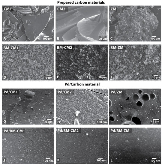 Similar results were obtained when Pd was deposited on the CM2 (Figure 2H) and BM-CM2 (Figure 2K) samples. Due to a higher specific surface area, the nanoparticles on the untreated CM2 did not cover the entire surface, although the particle size was larger than that on the samples processed in a ball mill: 9 nm for Pd/CM2 vs. 5 nm for Pd/BM-CM2 (Table 1).