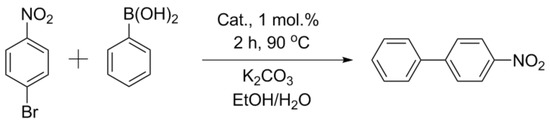 Phenylboronic acid (Fluorochem Ltd., Hadfield, UK), potassium carbonate (Reachem, Moscow, Russia) and laboratory-grade ethanol (Merck KGaA, Darmstadt, Germany) were purchased from commercial sources. Phenylboronic acid (0.1 mmol), bromoarene (0.075 mmol), potassium carbonate (0.1 mmol), a catalyst (1 mol.% Pd), laboratory-grade ethanol (2.5 mL) and water (0.5 mL) were placed in a 10 mL test tube and stirred with a magnetic stirrer (Heidolph Instruments GmbH & Co. KG, Schwabach, Germany) at a set temperature (50 °C and 90 °C for the corresponding reaction). A sample (200 µkL) of the Suzuki–Miyaura reaction mixture was taken, dissolved in DMSO-d6 (400 µkL) and the conversion was determined immediately by NMR spectroscopy at 300.1 MHz (1H) using the residual solvent peak as an internal standard.