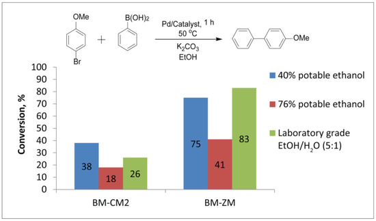 In turn, 40% potable ethanol gave an unexpected result. The conversions reached 38% and 75% in 1 h at 50 °C for the same catalysts, noticeably surpassing the conversions obtained in 76% potable ethanol (Table S10). Moreover, when the reaction was carried out in the presence of BM-CM2, the conversion in 40% potable ethanol was maximum, as compared to the conversions in 76% potable ethanol and the laboratory-grade EtOH/H2O mixture (5:1) (Figure 7). This experimental fact can be linked precisely to the fact that the reaction proceeds on the surface of undissolved substrate drops, where a locally increased concentration of reagents can be expected.