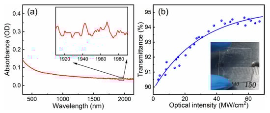 - Huang, J.; Qiao, W.; Li, G.; Yang, K.; Liang, Y.; Li, D.; Li, G.; Feng, T.; Zhao, J.; Zhao, S.; et al. Optical modulation of magnesium 2,5-dihydroxyterephthalate saturable absorber for passively Q-switched 2 μm solid-state laser. Appl. Phys. Express 2020, 13, 115003. [Google Scholar] [CrossRef]