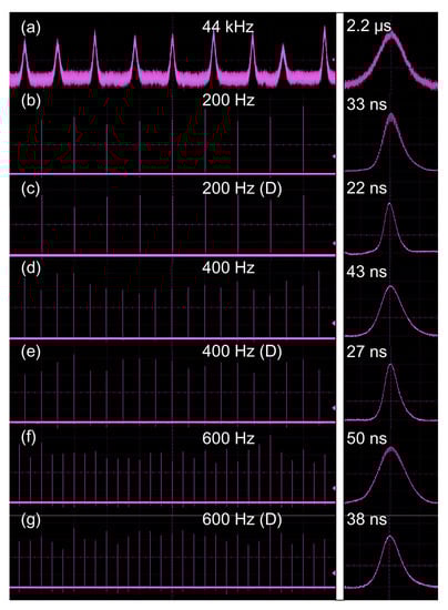 - Li, Z.; Xiong, Z.; Moore, N.; Lim, G.C.; Huang, W.L.; Huang, D.X. Pulse width reduction in AO Q-switched diode-pumped Nd:YVO4 laser with GaAs coupler. Opt. Commun. 2004, 237, 411–416. [Google Scholar] [CrossRef]