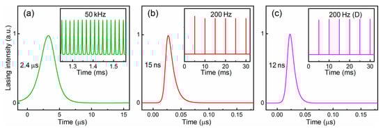 - Shang, J.; Yang, J.; Hao, H.; Li, Q.; Zhang, L.; Sun, J. Compact low-voltage electro-optic Q-switch made of LiNbO3. Opt. Express 2020, 28, 22287. [Google Scholar] [CrossRef] [PubMed]