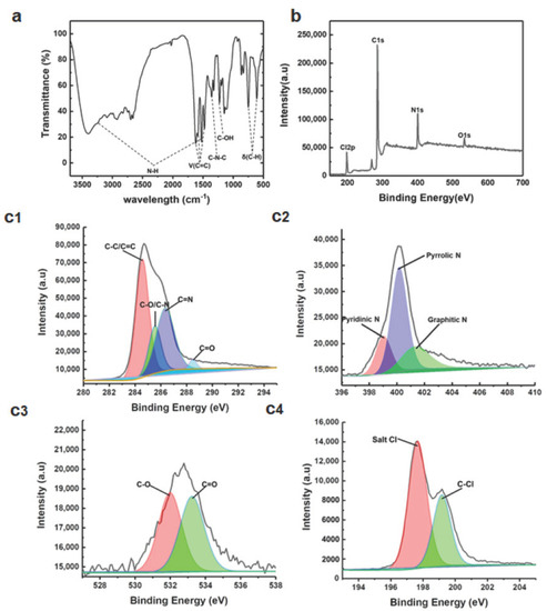 (a) FTIR spectrum of C-dots. (b) XPS survey spectrum of C-dots. (c1) High-resolution C1s XPS. (c2) High-resolution N1s XPS. (c3) High-resolution O1s XPS. (c4) High-resolution Cl XPS.