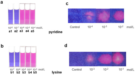 Although the solution assay demonstrated high sensitivity and convenience for the detection of NCOBs; however, solutions are not convenient to transport, store, and use in practical applications. Inspired by traditional pH test papers, we moved ahead to test the possibility of making a test paper version of this solution assay. Excitingly, we were able to fulfill this aim, and the test paper version of this assay is fully functional. Simply dropping sample solutions onto the test paper and a color change would indicate the presence of NCOBs. We found that the test paper assay behaved very similar to the solution assay. For instance, only pyridine solutions with concentrations higher than 10−4 M could turn the test paper into red; and the higher the concentration of pyridine, the deeper the color of test paper become (Figure 5c). Again, we tested lysine and obtained similar results; the only difference is that the minimum concentration required for a successful detection is slightly higher, reaching 10−3 M (Figure 5d). To our delight, the test paper assay was able to detect all the NCOBs discussed in the solution assay (Figure S2). Depending on the basicity of the NCOBs, the minimum concentrations required for a successful visual detection using the test paper are different, which have also been summarized and presented in Table 1. From Table 1 we could see that the minimum concentrations required for test paper detection are higher than those required in solution assays. However, the test paper assay has its advantages, such as ease in storage, transportation, and usage.