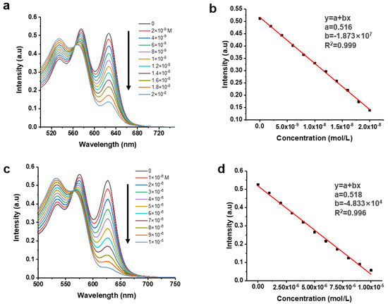 On the basis of the analysis, a calibration curve correlating concentrations of pyridine with the UV-vis absorption intensities at 626 nm of C-dots was successfully established (Figure 6b). As shown in the graph, the concentrations of pyridine have an excellent linear relationship (the correlation coefficient R2 is 0.999) with the absorption intensities of C-dots at 626 nm. According to well-accepted 3σ method [18,19], the LOD of this assay was determined to be 0.75 nM. When we further increased the concentration of pyridine (from 0 nM to 20 nM), we observed the saturation of signals when pyridine concentration is larger than 20 nM; however, the assay has very good linearity when pyridine concentration is less than 20 nM. The limit of quantitation (LOQ) of an assay is defined as the threshold at which the calibration curve could be confidently used to determine the concentration of an analyte. According to well-accepted 10σ method [18,19], the LOQ of this assay was determined to be 2.27 nM, thus the linear range of this assay is from 2.27 to 20 nM. We also tested lysine and found that concentrations of lysine and intensities of absorptions of C-dots at 626 nm also had a good correlation relationship (Figure 6c). Based on the calibration curve (Figure 6d), the LOD and linear range of this assay for the sensing of lysine were determined to be 0.29 μM and 0.88 to 10 μM, respectively.