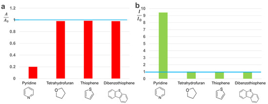 Selectivity of the NCOBs sensing assay towards oxygen and sulfur containing compounds: (a) UV-vis absorption-based assay, where A0 is the UV-vis absorption intensity of C-dots at 626 nm without any analytes, and A is the UV-vis absorption intensity of C-dots at 626 nm in the presence of 10−3 M analytes. (b) PL-based assay, where I0 is the PL intensity of C-dots at 606 nm without any analytes, and I is the PL intensity of C-dots at 606 nm in the presence of 10−3 M analytes.