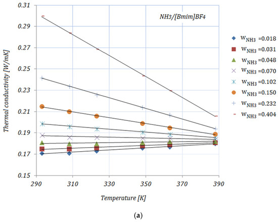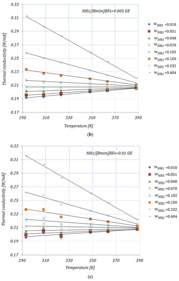 Figure 1a–e shows the variation of the thermal conductivity of NH3/[Bmim]BF4, NH3/[Bmim]BF4 + GE and NH3/[Bmim]BF4 + SWCNTs with the temperature at various NH3 fractions. With increasing temperatures can be seen that the thermal conductivities of all solutions have an upward trend up to w_NH3 = 0.048, then with increasing NH3 fractions (≥0.102), the thermal conductivities decrease with increasing temperatures, but increasing with increasing NH3 fractions. The addition of carbon nanomaterials to the ionic liquid leads to an enhancement in the solution’s thermal conductivity compared to the base solution. The enhancements in the thermal conductivity of the studied solutions—calculated as —at minimum and maximum NH3 fractions— and , respectively—are shown in Table 2: