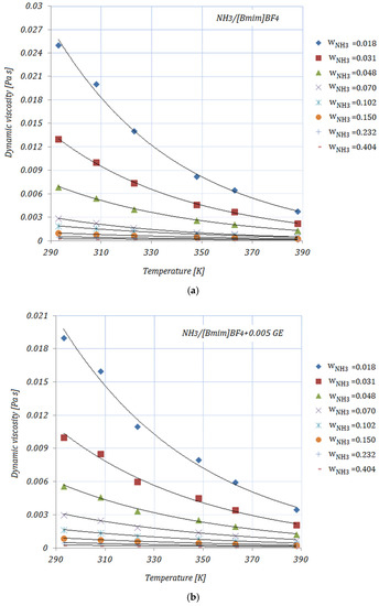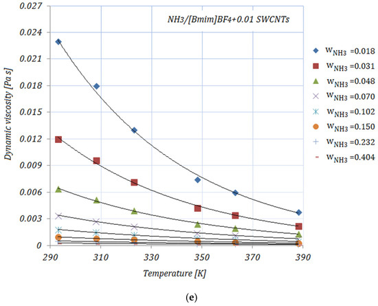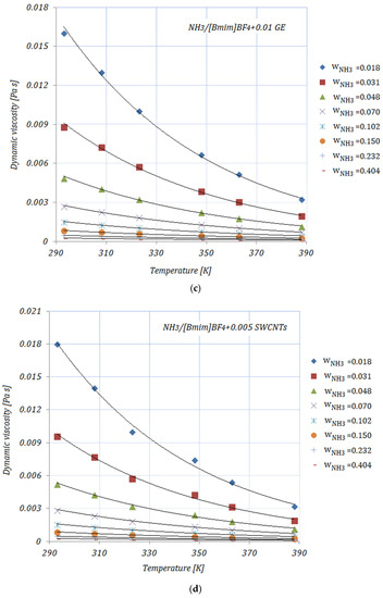 Figure 2a–e depict the variation in the viscosity of the solutions, with various NH3 fractions, at rising temperatures. As shown in Figure 2, the viscosities of the solutions decrease exponentially with higher temperatures. By adding the carbon nanomaterials into the ionic liquid, a reduction in viscosity may be seen compared to the base solution. Higher fractions of carbon nanomaterials lead to an increase in the viscosity of the studied solutions, but these viscosity values do not exceed those of the base solution. With higher NH3 fractions, a decrease in viscosity may also be seen. The diminution in viscosity is more obvious at the lower mass fractions of NH3 in the solutions. The viscosities of the NH3/IL+CNMs solutions are lower than that of the base solution, indicating that these solutions are suitable for NH3 absorption. The reduction in the viscosity of the studied solutions—calculated as —at minimum and maximum NH3 fractions— and , respectively—is shown in Table 4: