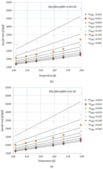 The reduction in the specific heat of the studied solutions—calculated as —at minimum and maximum NH3 fractions— and , respectively—is shown in Table 6: