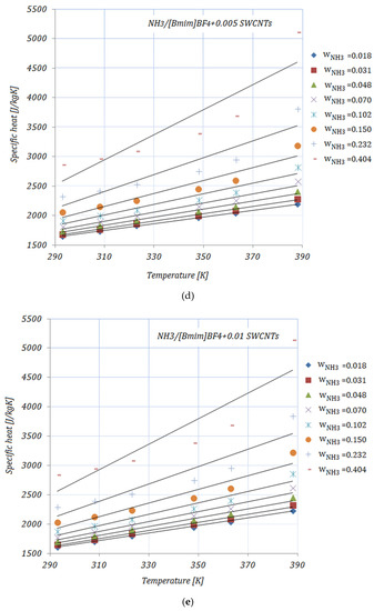 Figure 3a–e illustrate the variation in the specific heat of the solutions, with various NH3 fractions, at rising temperatures. As shown in Figure 3, the specific heat of the solutions increases with both higher temperatures and higher fractions of NH3. In addition, by adding nanoparticles to the ionic liquid, a reduction in specific heat may be seen compared to the base solution. Higher CNMs fractions led to a decrease in the specific heat of all the solutions. The presented results are according to an equation proposed by Raud et al. [34], which indicates the increase in a solution’s specific heat with rising temperatures, and also the reduction in specific heat by the addition of nanomaterials into the base solution.