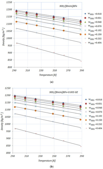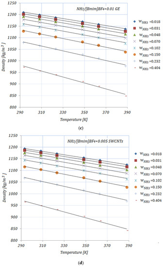 It can be seen from Table 2 that the maximum enhancement in thermal conductivity was achieved by, while the minimum enhancement in thermal conductivity was recorded for for both NH3 fractions. In addition, a descending trend in the thermal conductivity of solutions with higher NH3 fractions may be seen. These results may be explained by the thermal conductivities of carbon nanomaterials dispersed into the ionic liquid. Graphene (GE) exhibits a thermal conductivity of [28,29,30], while the thermal conductivity of SWCNTs is usually reported to be in the range of at a standard temperature (25 °C) [31]. Yu et al. [32] measured the thermal conductivity of SWCNTs using a chemical vapor deposition method and found a value higher than . The experimental results related to the thermal conductivity of ionic liquids revealed the increase in thermal conductivity achieved by adding nanoparticles into the ionic liquid and the minor influence of temperature on several ionic liquids containing nanoparticles. The main arguments for these trends are thermal boundary resistance, layering phenomena, and clustering [33].