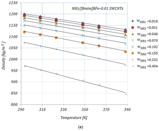 The densities of the solutions, with various NH3 fractions and at rising temperatures, are illustrated in Figure 4a–e. As can be seen, the density decreases with both higher temperature and higher NH3 fractions. The addition of carbon nanomaterials into the ionic liquid increases the solution’s density compared to the base solution. In addition, higher CNMs fractions lead to increased density for all solutions. Most experimental studies regarding the density of ionic liquids report an increase in density with the addition of nanoparticles and a decrease with higher temperatures. The presented results show the same trend as the experimental results obtained by other studies [35].