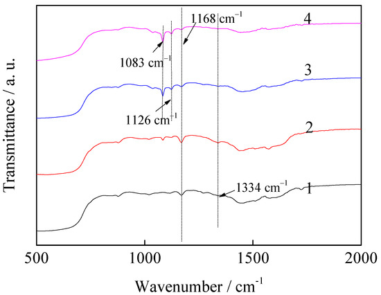 Infrared spectra of magnesite modified by [APMIM]Br with different loading amounts and 30% loading amount of the modified magnesite after adsorption ((1) 10% loading amount; (2) 20% loading amount; (3) 30% loading amount and (4) after adsorption).