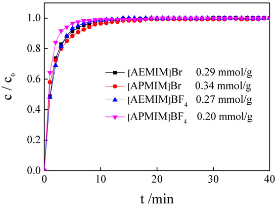 Four types of nanomaterials were fabricated by loading different types of ILs, ([AEMIM]Br, [APMIM]Br, [AEMIM]BF4 and [APMIM]BF4), at the loading amount of 10% on the calcined magnesite. The influence of the type of IL on the CO2 adsorption capacity was determined at the adsorption temperature of 50 °C and a gas flow rate of 100 mL/min. The adsorption curves of different modified magnesites are presented in Figure 4. This figure shows that the CO2 adsorption performance of the bromide-based magnesite is better than that of the tetrafluoroborate-based magnesite, with an effective adsorption time of >10 min. The CO2 effective adsorption times of the magnesite modified using [AEMIM]BF4 and [APMIM]BF4 are approximately 8 and 7 min, respectively. The CO2 adsorption capacity (Table 1) of the [AEMIM]Br-modified magnesite is 0.29 mmol/g, lower than that achieved by the [APMIM]Br-modified magnesite, i.e., 0.34 mmol/g. These results may be due to the fact that the tetrafluoroborate-based magnesite is gathered, and the particle size of bromide-based magnesite is uniform, which can be seen in the SEM images. Thus, the magnesite modified using [APMIM]Br was selected as the adsorbent in the subsequent experiments.