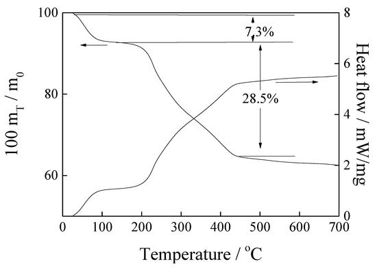 The TG-DSC curve of pure magnesite has been reported in our previous work [22], showing that the decomposition of magnesite to MgO happens from 400 °C to 800 °C. The TG-DSC curve of the [APMIM]Br-modified magnesite is shown in Figure 10. As the temperature is increased from 30 °C to 100 °C, the mass loss rate is approximately 7.3%, which can be attributed to the desorption of micromolecules or impurities, including H2O, CO2 and others adsorbed by the sample in air and residual solvents from the preparation process. A peak is observed at 200–450 °C, corresponding to the mass loss rate of 28.5%, accompanied by a DSC endothermic peak, which is attributed to the decomposition of the [APMIM]Br-modified magnesite. Therefore, at 30–100 °C, the [APMIM]Br-modified magnesite exhibits excellent thermostability.