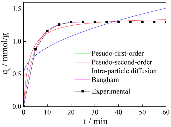 To study the adsorption kinetics of CO2 on the magnesite modified by [APMIM]Br, the pseudo-first-order, pseudo-second-order, intraparticle diffusion and Bangham models were used to fit the adsorption curves [35,36].
