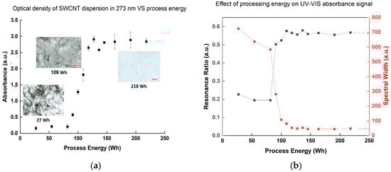 (a) Optical absorbance density of SWCNT dispersion samples in 273 nm dependent on the process energy. Optical microscopy images are presented for 3 process points: 27 Wh (beginning of the process), 109 Wh (middle), and 218 Wh (end of process). The scale bar in the images is 100 µm. (b) Resonance ratio and spectral width of the 273 nm peak dependent on the process energy.