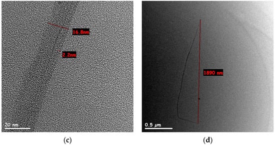 SWCNT water-based dispersions were examined under high-resolution TEM, to observe the effect of high-energy dispersion (218 Wh and 600 Wh, respectively) on the tube diameter and separation within bundles. According to the SWCNT manufacturer, the raw tubes have a diameter of 1.6 ± 0.5 nm and a length of more than 5 µm. The dispersion in 218 Wh (Figure 3a,b) showed a variety of bundles with an average diameter (measured over 10 bundles) of 20.9 ± 5 nm. SWCNT dispersion after 600 Wh (Figure 3c) showed significantly thinner bundles (average diameter of 13.5 ± 2.5 nm measured over 10 bundles), supposedly indicating better dispersion. However, while measuring the length of an individual tube is not trivial, bundles observed after 600 Wh exhibited a length of ~2.2 µm (Figure 3d)—shorter than the reported length of an individual tube. This observation, combined with Raman spectroscopy, indicated an increase in SWCNT defects and fracture after 600 Wh.