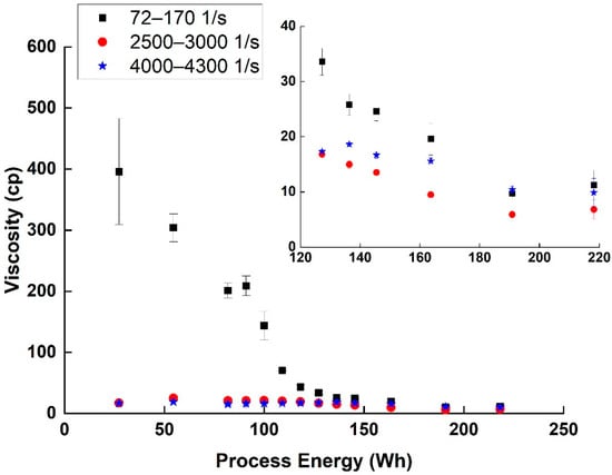 As can be seen (Figure 4), the shear-thinning effect, which is common in suspensions [17] decreased with the advancement of the dispersion process (i.e., increasing the invested energy). The plateau region (2500–3000 1/s) viscosity measured also decreased with the dispersion process from 25 cp at 54 Wh to 7 cp at 218 Wh. This decrease in shear-thinning and viscosity is usually connected to a decrease in the size of agglomerates resisting the flow, and thus is used as an indication of better dispersion [17,18].