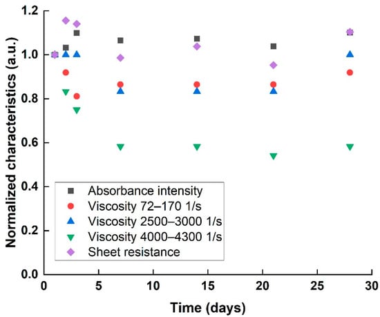 Absorbance intensity, viscosity in various shear rates, and sheet resistance values of aging 218 Wh dispersion process, normalized to 1st day values.