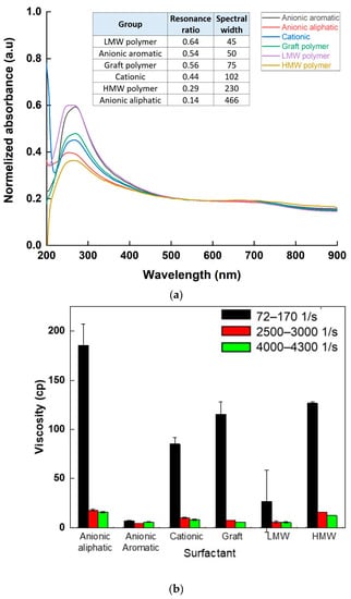 A total of 6 different types of surfactants were used to create SWCNT aqueous dispersions, and the resultant dispersions were analyzed according to the proposed characteristics: optical absorbance, rheological properties, and sheet resistance were characterized for each surfactant type. The UV-Vis absorbance spectrum (Figure 7a), normalized to the same baseline, indicated a difference both in peak height and sharpness between different surfactants: the highest absorbance values were observed when using anionic aromatic and LMW polymer surfactants, while the lowest one was observed using HMW polymer. A similar trend was observed quantitatively, comparing the resonance ratio and spectral width of the spectra (inset table, Figure 7a). Rheological behavior (Figure 7b) was comparable: although shear-thinning behavior in low shear rate was seen in all dispersions, the level of shear-thinning, which is related to SWCNT network creation, was different between surfactants. Both anionic aromatic and LMW polymer surfactants exhibited lower initial viscosity and lower shear-thinning than all the other surfactants. The anionic surfactants also had a very low G′ to G″ crossover point in the amplitude sweep (Table 3), showing a “liquid-like” behavior relating to low SWCNT agglomerates percentage and good dispersibility. Sheet resistance (Figure 7c) complimented the characteristics, with HMW polymer and anionic aliphatic surfactants showing the highest sheet resistivity values (~1011 Ω/sq), and anionic aromatic demonstrating the lowest resistivity (~103 Ω/sq). Clearly preferred surfactants emerged from all three characteristics: the anionic aromatic, with the LMW polymer as a close second. These results demonstrate the importance of surfactants as dispersion agents: processability (i.e., rheological properties) and final properties (e.g., electrical conductivity) are strongly affected not only by the properties and percentage of the filler but also by the quality of the dispersion. These results also propose “rules of thumb” for selecting an appropriate surfactant for SWCNT dispersibility: first and foremost, π-π stacking interactions [27], enabled by the aromaticity of the surfactant, stabilize the suspension better than electrostatic repulsion alone (seen by comparing aromatic to aliphatic anionic surfactants), most likely by strengthening the absorbance of the surfactant to the SWCNT. Moreover, as the surfactant should also stabilize the suspension sterically, small molecules penetrate the small spaces between the individual tubes in the agglomerates more easily [28,29], and exfoliate the tubes more efficiently, as demonstrated by the very clear advantage of the LMW polymer over its higher molecular weight counterpart as a surfactant.