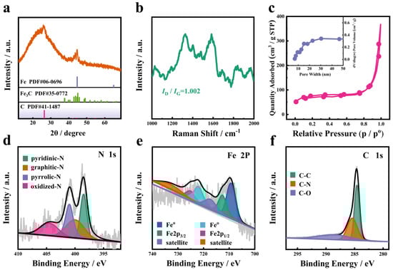 (a) XRD pattern, (b) Raman spectra, (c) pore size distribution and N2-sorption isotherm, (d–f) N 1s, Fe 2p and C 1s XPS spectra of the SiO2@Fe3C/Fe@NCNT-GT.
