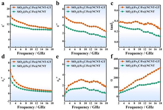 (a) ε′—f curves, (b) ε″—f curves, (c) tanδe—f curves, (d) εc″—f curves, (e) εp″—f curves and (f) α—f curves of SiO2@Fe3C/Fe@NCNT-GT and SiO2@Fe3C/Fe@NCNT.