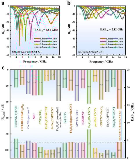 RL—f curves of (a) SiO2@Fe3C/Fe@NCNT-GT and (b) SiO2@Fe3C/Fe@NCNT, (c) the absorption performance of SiO2@Fe3C/Fe@NCNT-GT with previously reported absorbers.