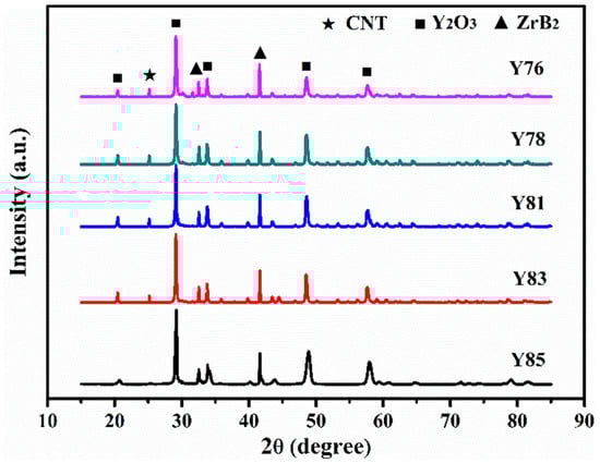 XRD spectra of Y2O3/ZrB2/CNT specimens with different Y2O3 contents.