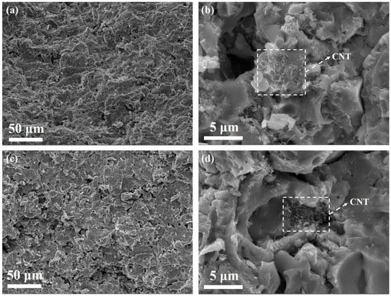 SEM images of Y2O3/ZrB2/CNT ceramics are shown in Figure 2. ZrB2 and CNT were evenly mixed with the Y2O3 matrix. The presence of a microporous structure during the plasma-spraying process may be related to unmelted agglomerates or resolidified agglomerates. Here, the theoretical density of Y2O3/ZrB2/CNT ceramics could be deduced according to the density of ZrB2 (6.08 g·cm3) and Y2O3 powder (5.01 g·cm3). Correspondingly, the relative densities of the Y2O3/ZrB2/CNT hybrid decreased with the Y2O3 powder content. Furthermore, the decrease in Y2O3 content increased the porosity of the material, but the increase in CNT content better filled the pores of the Y2O3/ZrB2/CNT ceramics (Figure 2a,b versus Figure 2c,d).