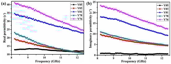 Figure 3 presents plots of ε′ and ε″ over 8.2 to 12.4 GHz, as the content of Y2O3 changed. In the full X-band, both ε′ and ε″ of the five samples slightly decreased as the frequency increased. In the Y85 sample, the ε′ was about 12.5, and the ε″ was only 0.8, indicating that the high content of Y2O3 and the relatively low content of ZrB2 lead to lower complex dielectric properties when there was no CNT. This also shows that the Y85 sample may possess a lower dielectric loss ability and poor absorbing ability.