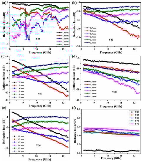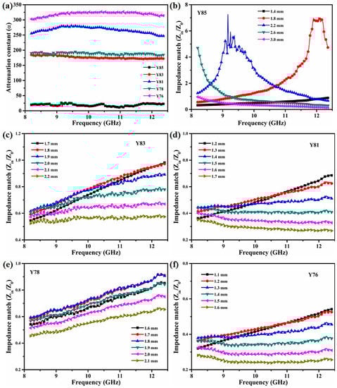 Figure 5a presents the α value of the five samples in the X-band. The Y85 sample showed an average α value of about 19.0, but the α value of doped-CNT samples had a major effect relative to the lowest α value seen in the undoped-CNT Y85 ceramic. These data further prove that the addition of CNT can improve EM attenuation, leading to good microwave absorption. The average α values of Y76 and Y81 were 319.8 and 267.1, respectively. The average α values of Y78 and Y83 were 188.8 and 176.4, respectively. The Y76 and Y81 values showed a larger α value versus Y78 and Y83, suggesting an exceptional EM wave attenuation ability. However, Y78 and Y83 ceramics had higher reflection loss values than Y76 and Y81: the attenuation constant only indicates that the material has a strong EM attenuation ability. No other factor could be considered, i.e., impedance matching. Figure 5b–f shows the impedance matching of five samples simulated at different absorbing thicknesses. Values of of Y85, Y81, and Y76 ceramics were far from 1, but Y83 and Y78 approached 1 as the absorbing thickness changed. These observations suggest that Y83 and Y78 samples absorb more EM waves. Therefore, good microwave absorption is related to both EM attenuation loss and impedance matching.