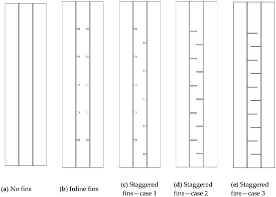 Various configurations of fins studied in this paper: (a) no-fins, (b) inline fins, (c) staggered fins, case 1, (d) staggered fins, case 2, and (e) staggered fins, case 3.