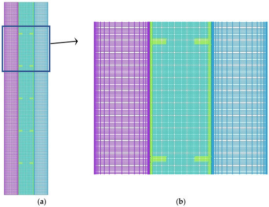 The configuration of the mesh after grid independence analysis (using 43,000 cells): (a) entire domain, (b) section zoom.