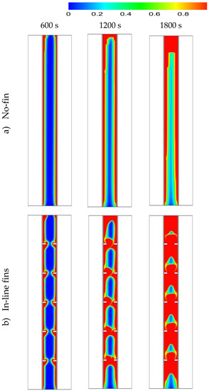In the case of no fins, the liquid fraction increased exponentially during the melting process, as shown in Figure 8. A total of 98% of the PCM melted within 4000 s and the whole PCM melted in 4727 s. The melting process decelerates over time due to the domination of the convection heat transfer over the conduction process. Within the inline fins, the charging process was achieved almost linearly in 2200 s, during which 96% of the PCM melted; then, it took around more than 800 s for the whole PCM to melt. Fast melting is caused by the fins, which deliver more heat through the system. The staggered fins enhance the melting process. The melting process followed the same procedure as that in the case of the inline fins within 1600 s; then, the melting rate accelerated due to the fins’ distribution and the location of a single fin close to the bottom.